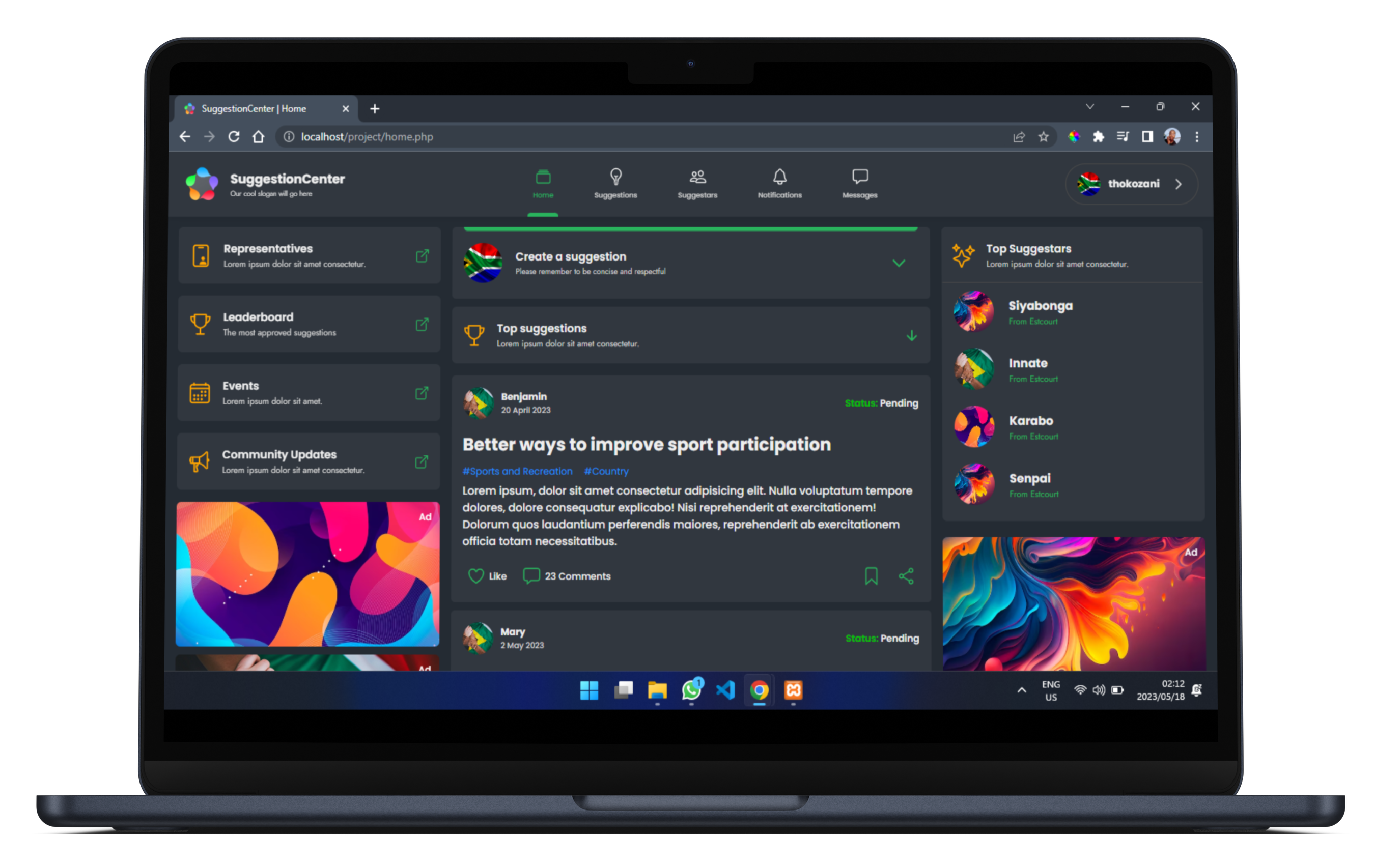 SuggestionCenter is a web application dedicated to fostering meaningful interaction between the government and its citizens. Our platform serves as a collaborative space where citizens can contribute their innovative ideas and suggestions, helping shape how the government interacts with its people in the most beneficial way for the country.